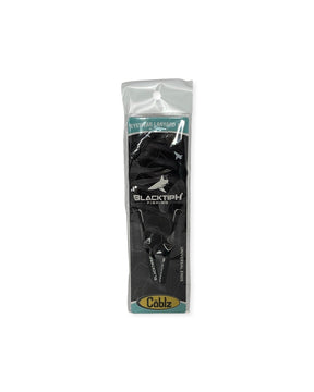 "Get Custom Fitted" Cablz are adjustable and have new universal rubber ends, allowing you to wear a "clinched" or "extended" style. They are custom fit, low profile, lightweight, and keep your glasses secure. The rubber ends are labeled "BLACKTIPH" and our BlacktipH Shark logo is attached to a button on the Cablz itself.