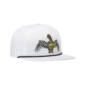 This 5-panel Supplex performance hat with embroidered Pelican design features a flat bill with black DryZone underbill to reduce glare and wick moisture. The snap back closure offers a versatile fit and the black rope detail adds contrast to this fun design.